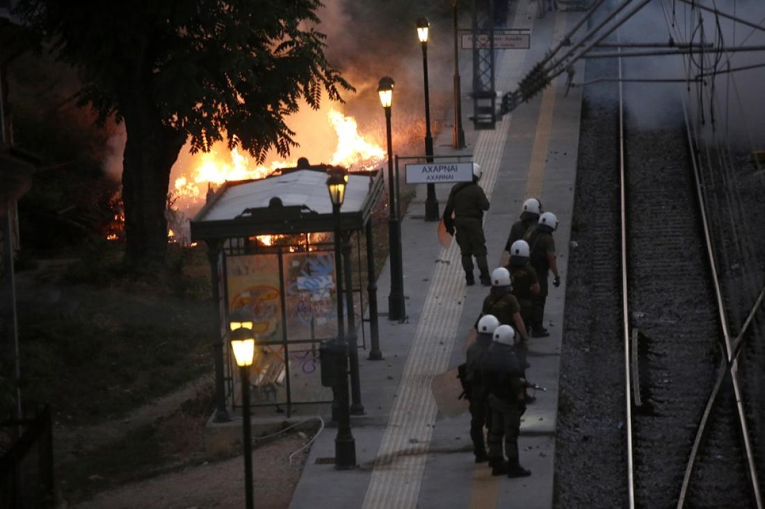 Από την πλευρά τους ορισμένοι νεαροί απάντησαν με πέτρες εναντίον των ΜΑΤ και αυτή η κατάσταση συνεχίστηκε με σποραδικά διαλείμματα και επιθέσεις με βόμβες μολότοφ. Οι Αρχές κατάφεραν να απωθήσουν εκ νέου τους νεαρούς και ο κύριος όγκος της διαδήλωσης διαλύθηκε ενώ η ομάδα των περίπου 150 νεαρών που προκαλούν τις ταραχές μεταφέρθηκαν στην οδό Λιοσίων όπου άναψαν φωτιές σε κάδους και συνέχισαν να πετούν πέτρες προς τις δυνάμεις των ΜΑΤ.