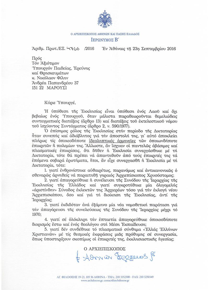 Δείτε τη νέα επιστολή Ιερώνυμου
