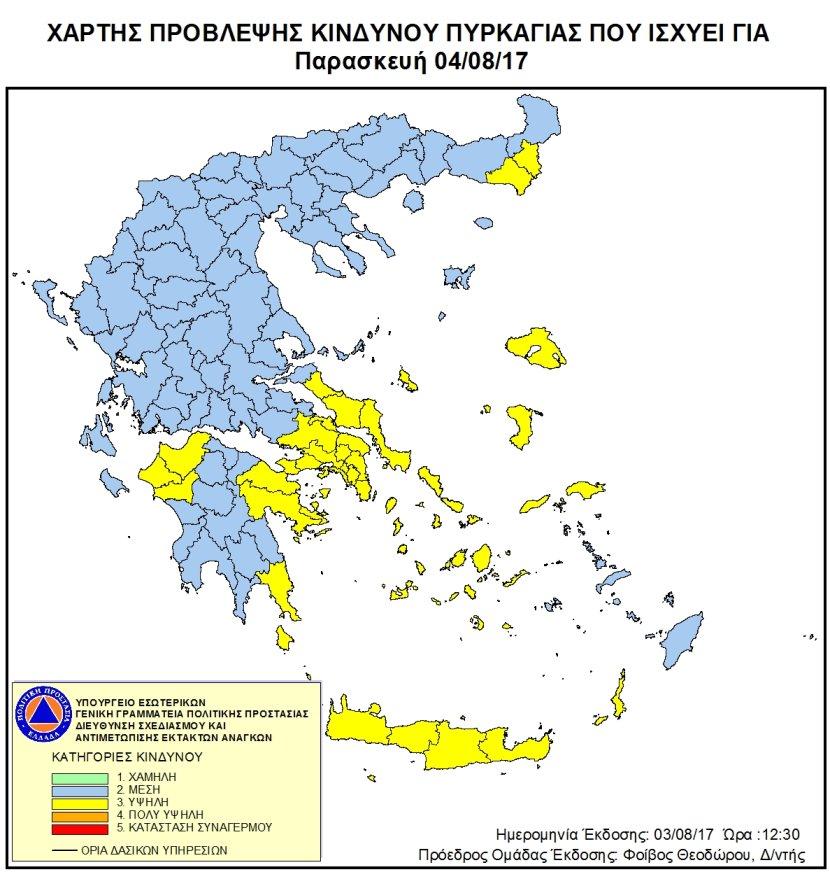 Παράλληλα, σύμφωνα με τον ημερήσιο χάρτη πρόβλεψης κινδύνου πυρκαγιάς που εκδίδει η Γενική Γραμματεία Πολιτικής Προστασίας, παρουσιάζεται πτώση από κατηγορία 4, σε κατηγορία 3, από πολύ υψηλό σε υψηλό κίνδυνο δηλαδή πρόκλησης πυρκαγιάς για περιοχές της Δυτικής Ελλάδας, της Πελοποννήσου, της Αττικής, της Στερεάς Ελλάδας και της Εύβοιας, της Κρήτης, της Θράκης και νησιών του Βορείου και Νοτίου Αιγαίου.