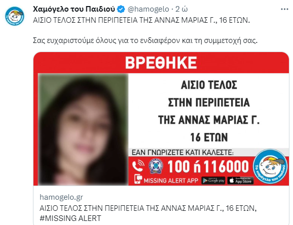 Σύμφωνα με την ανακοίνωση του Χαμόγελου του Παιδιού, η περιπέτεια της Άννας Μαρίας Γ. , 16 ετών, έληξε, δίνοντας τέλος στην αγωνία των δικών της ανθρώπων που την αναζητούσαν. Η Άννα Μαρία Γ. βρέθηκε και είναι καλά στην υγεία της.
