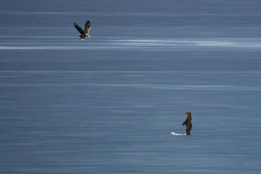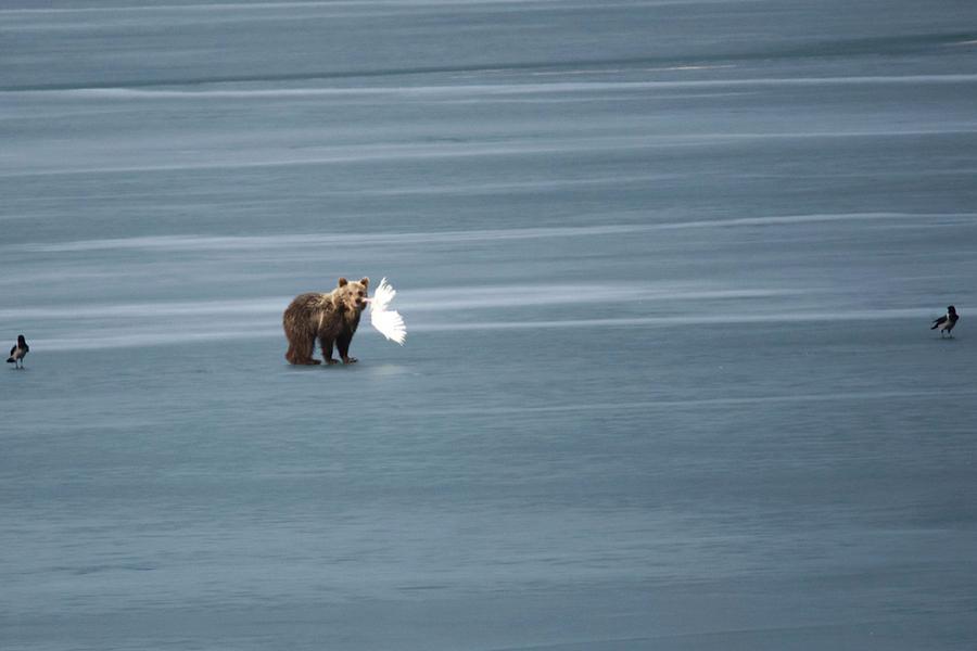 Μάλιστα όσοι παρακολουθούσαν με κιάλια και φωτογραφικές μηχανές την πορεία του ζώου μέσα στην παγωμένη λίμνη έγιναν μάρτυρες μια μικρής διαμάχης ανάμεσα στην επισκέπτρια αρκούδα και ένα σπάνιο θαλασσαετό.