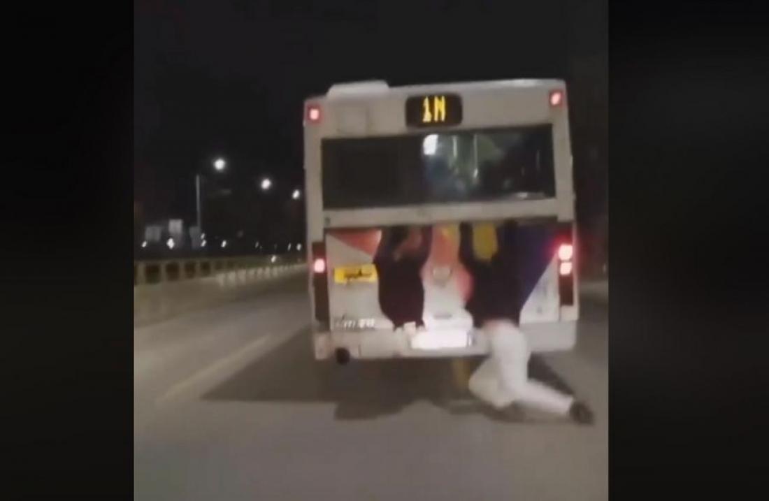 Ειδικότερα, έχουν κρεμαστεί στο πίσω μέρος του αστικού λεωφορείου της γραμμής "Ν1" σαν... "κασκαντέρ", προκειμένου να μετακινηθούν, παίζοντας τη ζωή τους κορώνα - γράμματα.