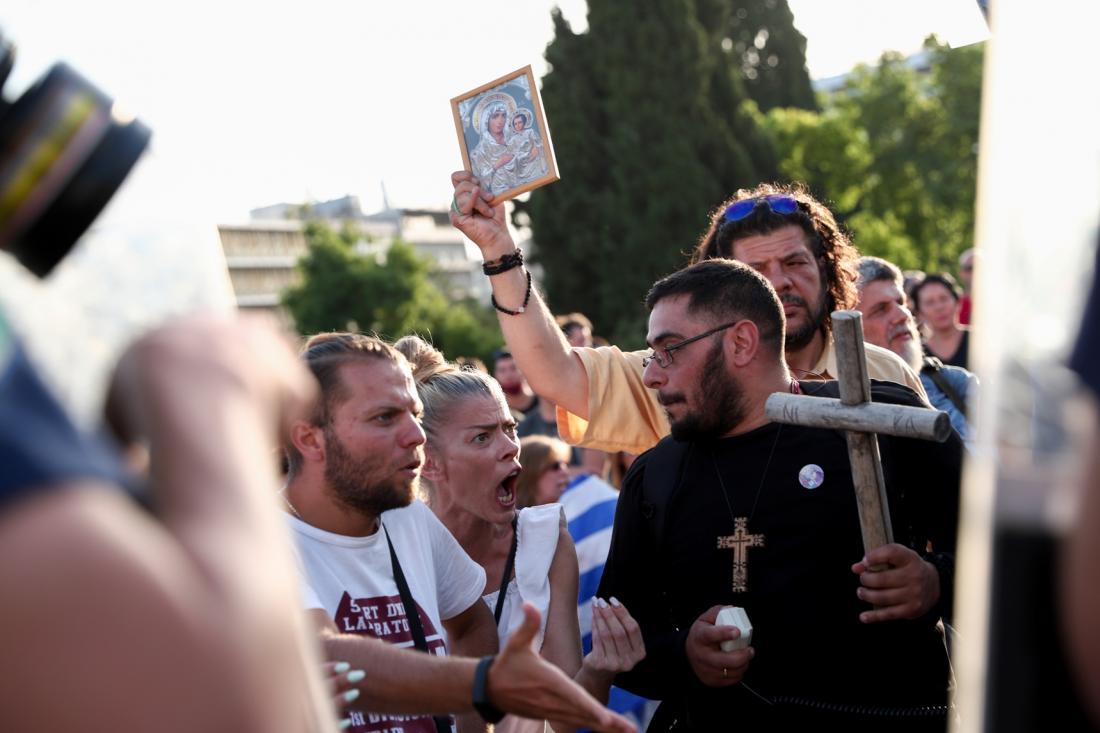 Λίγο μετά τις 19:30 το απόγευμα της Τετάρτης συγκεντρωμένοι έξω από τη Βουλή των Ελλήνων φωνάζουν συνθήματα κατά του πρωθυπουργού και του υποχρεωτικού εμβολιασμού, αναφέροντας μεταξύ άλλων, «κάτω τα εμβόλια» και «έξω οι Μασόνοι από την Ελλάδα».