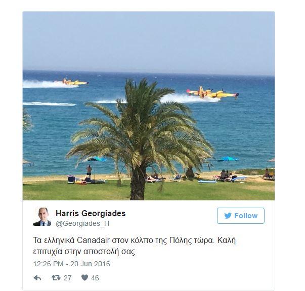 Με ανάρτησή του στο twitter, o Υπουργός Οικονομικών Χάρης Γεωργιάδης, ανέβασε φωτογραφία από τον ανεφοδιασμός των δύο Canadair από την Πόλη Χρυσοχούς.