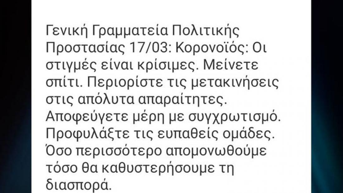 Επείγουσα ειδοποίηση έστειλε στα κινητά των πολιτών η Γενική Γραμματεία Πολιτικής Προστασίας για τον κορωνοϊό, ζητώντας από τους πολίτες να μείνουν στο σπίτι καθώς «οι στιγμές είναι κρίσιμες».