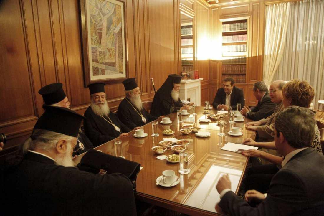 Αρχικά ο Μακαριώτατος αναφέρθηκε στη χθεσινή συνάντηση του ιδίου, των Σεβασμιωτάτων Μητροπολιτών Μονεμβασίας και Σπάρτης κ. Ευσταθίου, Φθιώτιδος κ. Νικολάου και Μεσογαίας και Λαυρεωτικής κ. Νικολάου, του Θεοφιλεστάτου Επισκόπου Μεθώνης κ. Κλήμεντος και του Νομικού Συμβούλου της Ιεράς Συνόδου κ. Θεοδώρου Παπαγεωργίου, με τον Πρόεδρο της Κυβερνήσεως κ. Αλέξη Τσίπρα, τον Πρόεδρο των ΑΝΕΛ κ. Πάνο Καμμένο, τον Υπουργό Παιδείας, Έρευνας και Θρησκευμάτων κ. Νικόλαο Φίλη και την υφυπουργό παρά τω Πρωθυπουργώ και Κυβερνητική Εκπρόσωπο κ. Όλγα Γεροβασίλη.