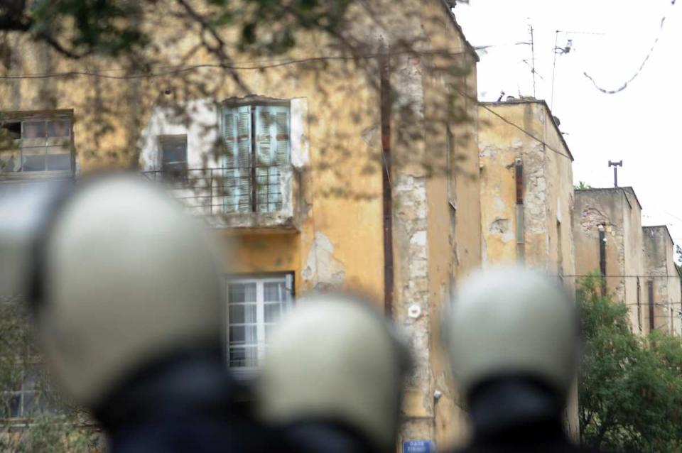 Πριν περίπου μία ώρα, ομάδες αντιεξουσιαστών που έχουν καταλάβει τα κτίρια αυτά στα οποία σύμφωνα με την ΓΑΔΑ δεν κατοικούν οικογένειες, είναι εγκαταλελειμμένα και χρησιμοποιούνται κατά καιρούς από καταληψίες, αντιεξουσιαστές, πρόσφυγες κλπ. έστησαν μεγαφωνική εγκατάσταση με δυνατή μουσική και συνθήματα εναντίον της Χρυσής Αυγής και άρχισαν να πετούν πέτρες προς τους αστυνομικούς.