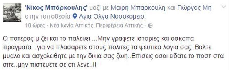 Ο νεαρός, θυμωμένος με όλα αυτά που γράφτηκαν για τον πατέρα του, έγραψε: «Ο πατέρας μου ζει και το παλεύει ...Μην γράφετε ιστορίες και άσκοπα πράγματα...για να πλασαρετε στους πολίτες τα ψεύτικα λογια σας.. Βαλτε μυαλο και ασχοληθείτε με την δικια σας ζωη..Επίσης οσοι είδατε το ποστ στα σιτε..μην πιστεύετε σε ότι λενε..!!».