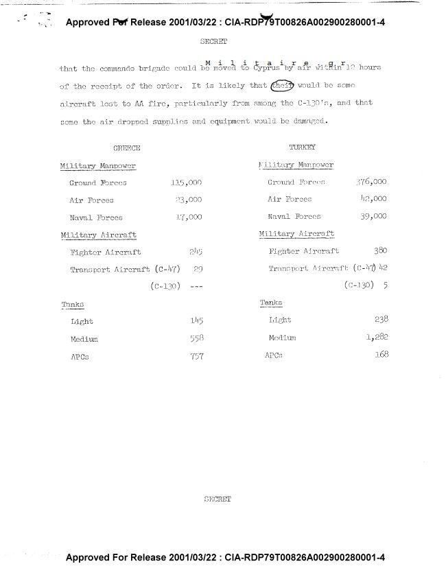 Η ανάλυση της CIA εκτιμά τις δυνάμεις και τον εξοπλισμό που μπορούν να μεταφέρουν οι Τούρκοι σε 12 ώρες στην Κύπρο μέσω θαλάσσης και αέρας. Όλα αυτά αφού έχουν εξασφαλίσει ότι η άμυνα της Κύπρου αποδυναμώθηκε με την απόσυρση της Μεραρχίας με τη πλήρη συνεργασία των χουντικών!