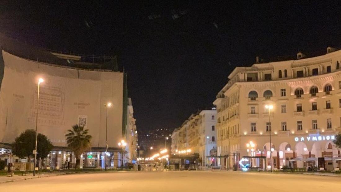 Ελάχιστα αυτοκίνητα διασχίζουν, με μεγάλες ταχύτητες, την παραλιακή Λεωφόρο Νικης, όπου λιγοστοί τολμηροί (και λόγω κρύου) περιπατητές, τηρώντας την απαραίτητη απόσταση ασφαλείας, ανταλλάσσουν βιαστικά νεύματα εν είδει χαιρετισμού. Τα κάγκελα που ξεκινούν από τον Λευκό Πύργο κρατούν μακριά από τη Νέα Παραλία αυτούς που έχουν βγάλει για βραδινή βόλτα τους τετράποδους φίλους τους και το περίκλειστο κομμάτι της είναι -όπως άλλωστε ήταν και ο στόχος των μέτρων- άδειο, με αστυνομικούς σε μηχανές να περιπολούν για τυχόν παραβάτες.