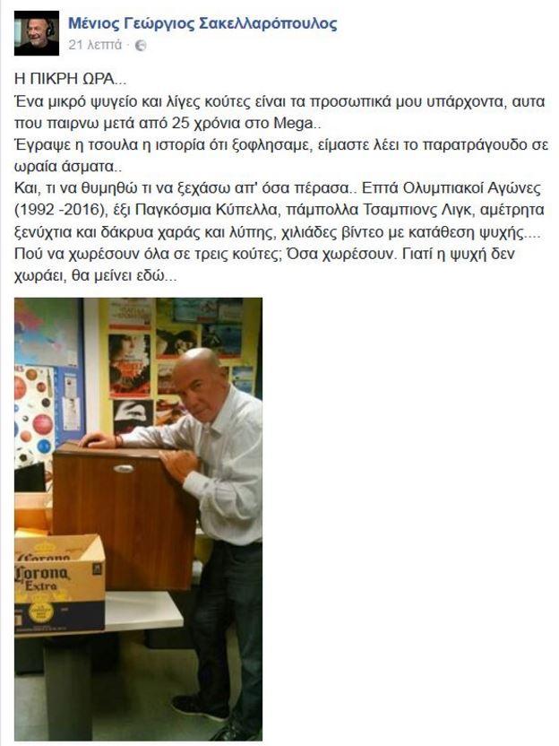 "Η ΠΙΚΡΗ ΩΡΑ... Ένα μικρό ψυγείο και λίγες κούτες είναι τα προσωπικά μου υπάρχοντα, αυτα που παιρνω μετά από 25 χρόνια στο Mega.. Έγραψε η τσουλα η ιστορία ότι ξοφλησαμε, είμαστε λέει το παρατράγουδο σε ωραία άσματα.. Και, τι να θυμηθώ τι να ξεχάσω απ' όσα πέρασα.. Επτά Ολυμπιακοί Αγώνες (1992 -2016), έξι Παγκόσμια Κύπελλα, πάμπολλα Τσαμπιονς Λιγκ, αμέτρητα ξενύχτια και δάκρυα χαράς και λύπης, χιλιάδες βίντεο με κατάθεση ψυχής.... Πού να χωρέσουν όλα σε τρεις κούτες; Όσα χωρέσουν. Γιατί η ψυχή δεν χωράει, θα μείνει εδώ..."