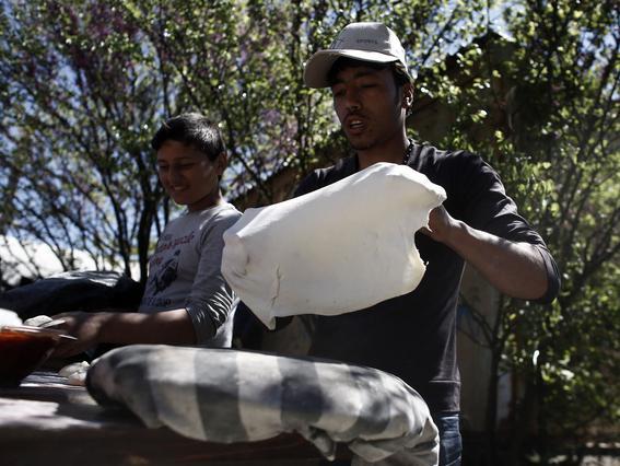 Ο νεαρός που ζυμώνει είναι ο Παλαιστίνιος Μουράντ και μαζί με τους φίλους του -Σύροι και Παλαιστίνιοι από τον καταυλισμό του Γιαρμούκ- παρασκευάζουν καθημερινά αυτές τις πίτες, που γίνονται ανάρπαστες από τους ενοίκους της σκηνούπολης στην Ειδομένη. Προτού καλά καλά αρχίσει το ψήσιμο σχηματίζεται ουρά μπροστά από τον πάγκο και μικροί και μεγάλοι περιμένουν υπομονετικά να ετοιμαστεί η παραγγελία τους.