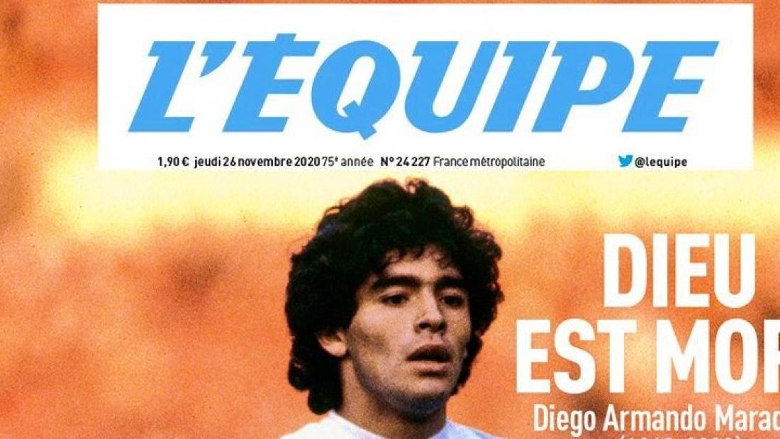 «Ο θάνατος ενός θεού»... Αυτές είναι οι λέξεις που επέλεξε ιστορική γαλλική αθλητική εφημερίδα, L' Equipe, για την πρώτη της σελίδα σήμερα. Η είδηση του θανάτου του Ντιέγκο Μαραντόνα, αποτέλεσε πρώτο θέμα στα ΜΜΕ σε όλο τον κόσμο σε λίγα λεπτά. Και σήμερα η εικόνα του με τη φανέλα της Αργεντινής, βρίσκεται στις πρώτες σελίδες των εφημερίδων σε όλο τον κόσμο.