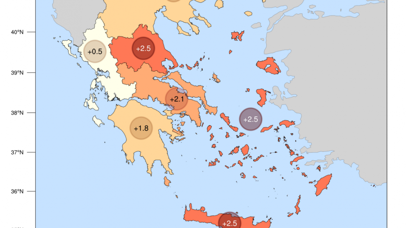 Η μέση τιμή των μέγιστων ημερήσιων θερμοκρασιών τον φετινό Νοέμβριο κυμάνθηκε σε ακραία υψηλά επίπεδα σχεδόν στο σύνολο της χώρας, σε σχέση με τον μέσο όρο της περιόδου 2010-2019, σύμφωνα με το δίκτυο 51 μετεωρολογικών σταθμών του meteo.gr του Εθνικού Αστεροσκοπείου Αθηνών (ΕΑΑ).