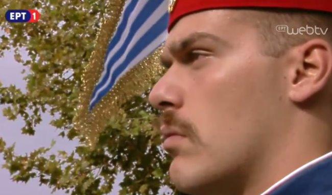 Ένας από τους τσολιάδες που βρίσκονταν μπροστά στους επίσημους, κέντρισε το ενδιαφέρον του ωραίου φύλου με την κορμοστασιά του και το αγέρωχο βλέμμα του.