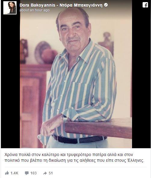 "Χρόνια πολλά στον καλύτερο και τρυφερότερο πατέρα αλλά και στον πολιτικό που βλέπει τη δικαίωση για τις αλήθειες που είπε στους Έλληνες", γράφει η βουλευτής της Νέας Δημοκρατίας.