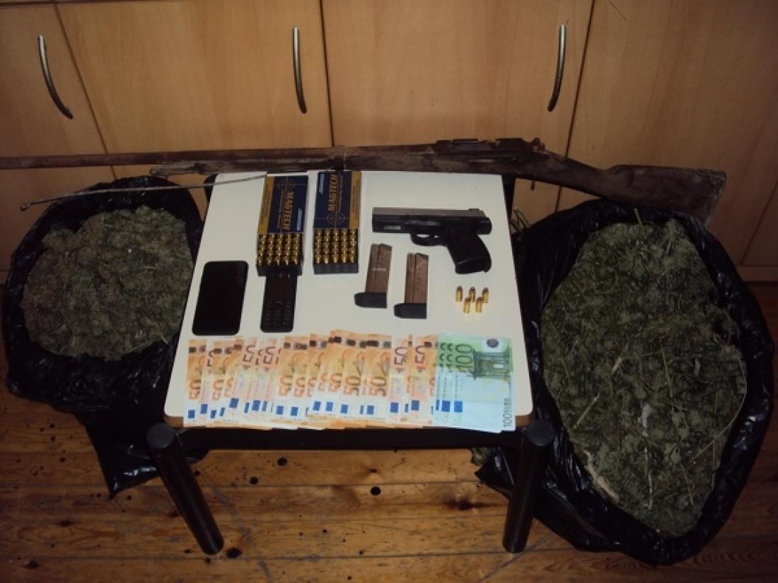 Σύμφωνα με την Αστυνομία, σε έρευνα που έγινε στο σπίτι των δύο ανδρών ηλικίας 59 και 27 ετών, καθώς και σε ποιμνιοστάσια, βρέθηκαν 4 κιλά και 72 γραμμάρια κάνναβης, 25 αποξηραμένα δενδρύλλια κάνναβης, (ύψους έως 2 μέτρων) πολεμικό όπλο, πιστόλι και 2 γεμιστήρες, 105 φυσίγγια, το χρηματικό ποσό των 1.400 ευρώ και 2 κινητά τηλέφωνα.