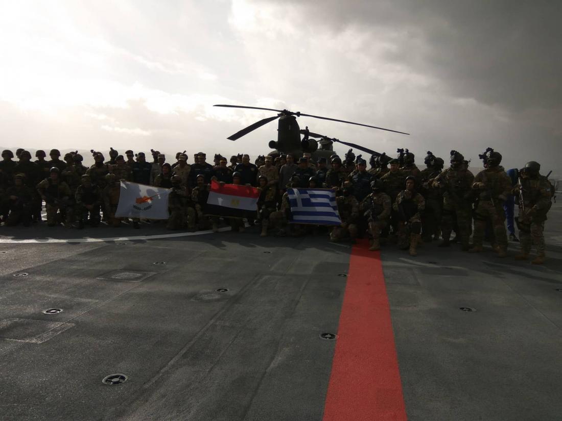 Οι Υπουργοί Άμυνας των τριών χωρών παρακολούθησαν την τελική φάση από αιγυπτιακό ελικοπτεροφόρο και ελληνική φρεγάτα.