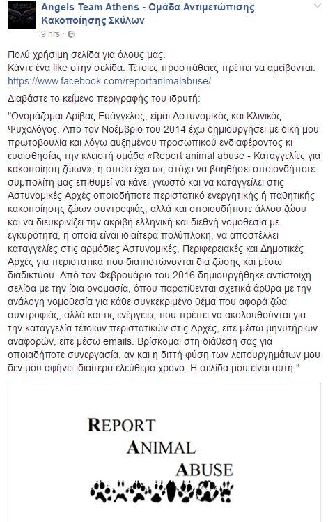 Με ένα ποστ χτες το απόγευμα, Μεγάλης Πέμπτης, η ομάδα μας ενημέρωσε για μια ακόμα ομάδα την «Report animal abuse», που προσπαθεί να σταματήσει τη βία εναντίον ανυπεράσπιστων ζώων. ()