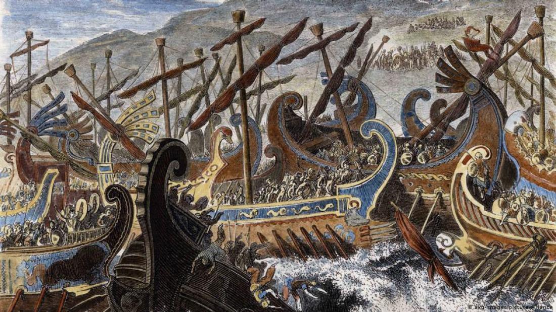 Μέσα σε αυτές τις καταθλιπτικές εικόνες έρχεται το αναπόφευκτο flashback στο μακρινό παρελθόν. Η SZ γράφει: «Πριν από 2500 χρόνια - το πρωί της 25ης Σεπτεμβρίου ή της 29ης Σεπτεμβρίου, κανείς δεν ξέρει ακριβώς πότε – η προοπτική της ιστορίας ήταν διαφορετική. Ο Ξέρξης, ο βασιλεύς των Περσών, κάθισε σε ένα χρυσό θρόνο σε έναν λόφο κάπου στο Πέραμα (…) Από εκεί παρακολουθούσε τη ναυμαχία (…) Δεν έπρεπε να πολεμήσει, αυτό θα το έκαναν οι στρατηγοί και οι ναύαρχοί του. Την ημέρα εκείνη η ναυμαχία, υπολόγιζαν οι Πέρσες, θα ήταν ο τελευταίος θρίαμβος της τεράστιας αυτοκρατορίας ενάντια στην ενοχλητική, επαναστατική, μικρή Ελλάδα. Τις προηγούμενες εβδομάδες οι Πέρσες είχαν κατατροπώσει τους Σταρτιάτες και τον Λεωνίδα στις Θερμοπύλες (…) Μόλις είχαν καταλάβει την Αθήνα, η οποία είχε εκκενωθεί προληπτικά, είχαν λεηλατήσει τους ναούς στην Ακρόπολη, σκότωσαν και έκαψαν ιερείς (…) Ο Ξέρξης ήθελε να κλείσει επιτέλους το κεφάλαιο αυτό και να επιστρέψει στην πατρίδα του, στα πλούσια ανάκτορα στα Σούσα και την Περσέπολη, στο σημερινό Ιράν, χιλιάδες χιλιότερα μακριά. Ο πατέρας του, ο Δαρείος, είχε ήδη κάνει την πρώτη εκστρατεία στην Ελλάδα δέκα χρόνια νωρίτερα και έχασε στη Μάχη του Μαραθώνα.»