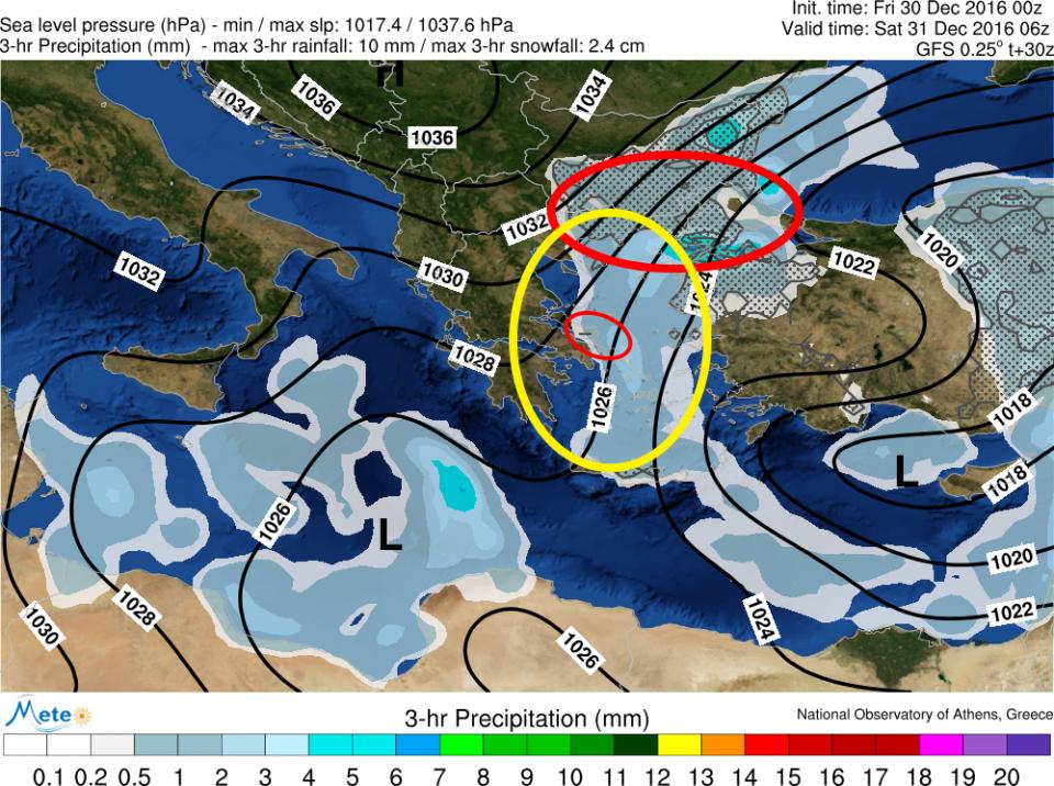 Για το Σάββατο 31/12/2016 (Παραμονή Πρωτοχρονιάς) προβλέπονται χιονοπτώσεις σε πολύ χαμηλά υψόμετρα των περιοχών της Θράκης (κυρίως Ν. Έβρου), Χαλκιδικής, των νησιών του Β. Αιγαίου, Ανατολικής Θεσσαλίας (Μαγνησία-Πήλιο), Σποράδες, Ανατολικής Στερεάς (συμπεριλαμβανομένης της Αττικής), Εύβοιας, Βόρειας και Ανατολικής Πελοποννήσου, ενώ χιονόνερο ή βροχές θα σημειωθούν στα πεδινά των νησιών του Κεντρικού και Νοτίου Αιγαίου. Από τις βραδινές ώρες τα φαινόμενα αναμένεται να εξασθενήσουν από βορρά προς νότο, με εξαίρεση την Εύβοια. Παγετός θα σημειωθεί στα κεντρικά και βόρεια ηπειρωτικά, κατά τόπους στα βόρεια ολικός (αρνητικές θερμοκρασίες ολόκληρη την ημέρα).