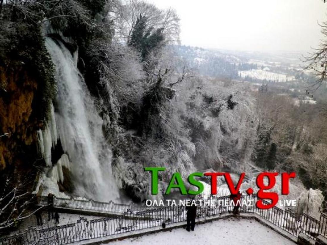 Η πόλη της Εδεσσας ντυμένη στα άσπρα και στην «κατάψυξη». «Τυχεροί» όμως οι τουρίστες που επιοσκέφτηκαν τους ονομαστούς καταρράκτες της πόλης. Είχαν την ευκαιρία να απολαύσουν το μοναδικό θέαμα του παγωμένου καταρράκτη.