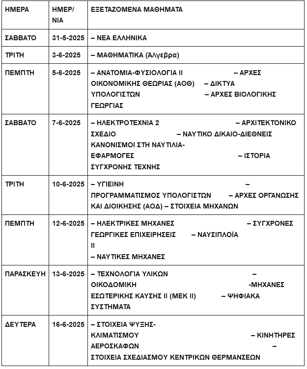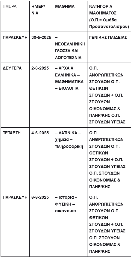 Ανακοινώθηκε το πρόγραμμα Πανελλαδικών Εξετάσεων ημερήσιων και εσπερινών ΓΕΛ και ΕΠΑΛ, Ειδικών και Μουσικών μαθημάτων και η προθεσμία Υγειονομικής Εξέτασης και Πρακτικής Δοκιμασίας των υποψηφίων για εισαγωγή στα ΤΕΦΑΑ, έτους 2025 .
