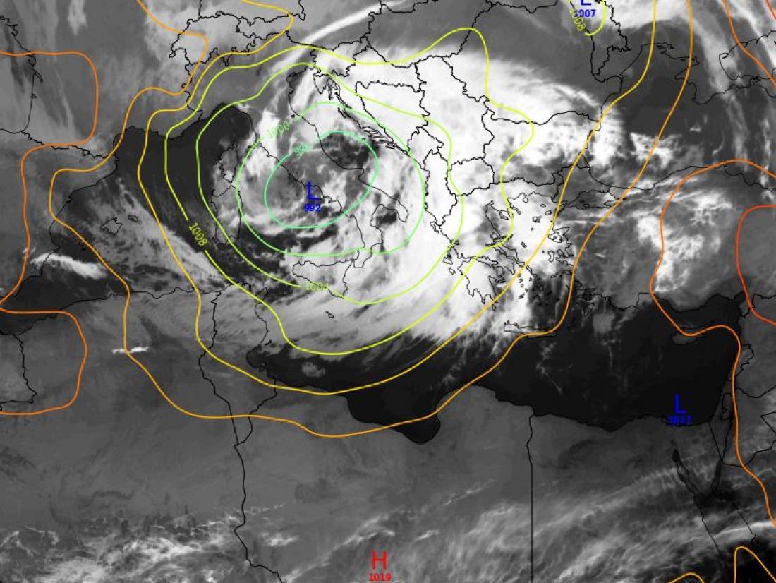 Στην Εικόνα 1 παρουσιάζεται η θέση του κέντρου του βαρομετρικού χαμηλού (με “L”) καθώς και οι νεφικοί σχηματισμοί που καλύπτουν το σύνολο σχεδόν του ελληνικού χώρου στις 08:00 τοπική ώρα.