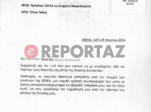 Σε επιστολή της προς τον Πρόεδρο της Ένωσης Σταμάτη Νικολόπουλο αναφέρει, μεταξύ άλλων, ως λόγο την "εχθρική συμπεριφορά των οργάνων της ΕΣΗΕΑ".