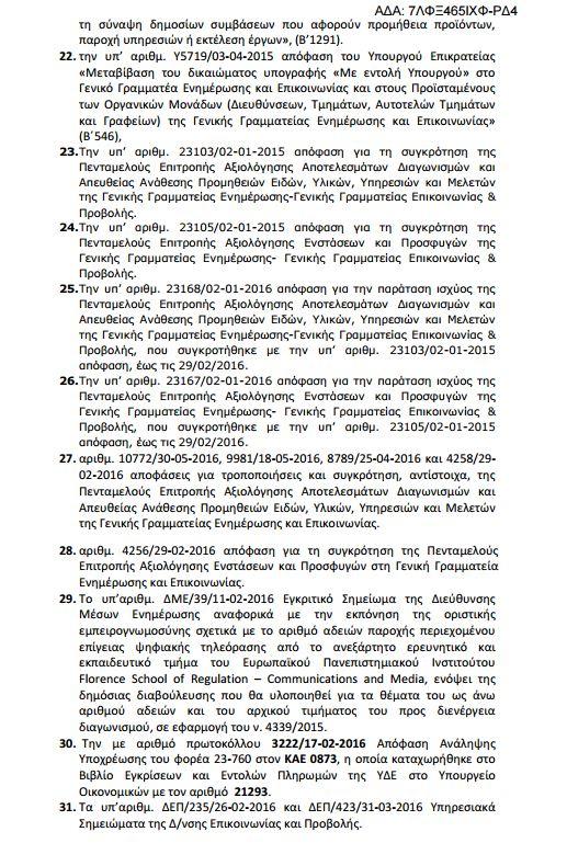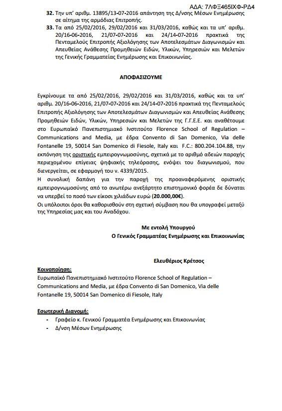 Στην απόφαση της Γενικής Γραμματείας Ενημέρωσης και Επικοινωνίας που δημοσιεύτηκε στη Διάυγεια αναφέρεται: «Εγκρίνουμε τα από 25/02/2016, 29/02/2016 και 31/03/2016, καθώς και τα υπ' αριθμ. 20/16-06-2016, 21/07-07-2016 και 24/14-07-2016 πρακτικά της Πενταμελούς Επιτροπής Αξιολόγησης των Αποτελεσμάτων Διαγωνισμών και Απευθείας Ανάθεσης Προμηθειών Ειδών, Υλικών, Υπηρεσιών και Μελετών της Γ.Γ.Ε.Ε. και αναθέτουμε στο Ευρωπαϊκό Πανεπιστημιακό Ινστιτούτο Florence School of Regulation – Communications and Media, με έδρα Convento di San Domenico, Via delle Fontanelle 19, 50014 San Domenico di Fiesole, Italy και F.C.: 800.204.104.88, την εκπόνηση της οριστικής εμπειρογνωμοσύνης, σχετικά με το αριθμό αδειών παροχής περιεχομένου επίγειας ψηφιακής τηλεόρασης, ενόψει του διαγωνισμού, που διενεργείται, σε εφαρμογή του ν. 4339/2015. Η συνολική δαπάνη για την παροχή της προαναφερόμενης οριστικής εμπειρογνωμοσύνης από το ανωτέρω ανεξάρτητο επιστημονικό φορέα δε δύναται να υπερβεί το ποσό των είκοσι χιλιάδων ευρώ (20.000,00€). Οι υπόλοιποι όροι θα καθορισθούν στη σχετική σύμβαση που θα υπογραφεί μεταξύ της Υπηρεσίας μας και του Αναδόχου».