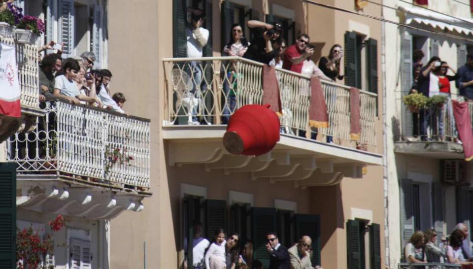 Με το σήμα της πρώτης Ανάστασης, οι κάτοικοι της Κέρκυρας, έβγαλαν στα μπαλκόνια τους τα κόκκινα εμβλήματα, απομεινάρια της ενετοκρατίας και πέταξαν τα τεράστια κόκκινα κανάτια, γεμάτα από νερό, με τις κορδέλες τους να χορεύουν στην πτώση τους κάτω από τους ήχους των φιλαρμονικών σε έντονους εορταστικούς ρυθμούς, και τους βροντερούς κανονιοβολισμούς που ακούγονταν από το Παλιό Φρούριο της Κέρκυρας.