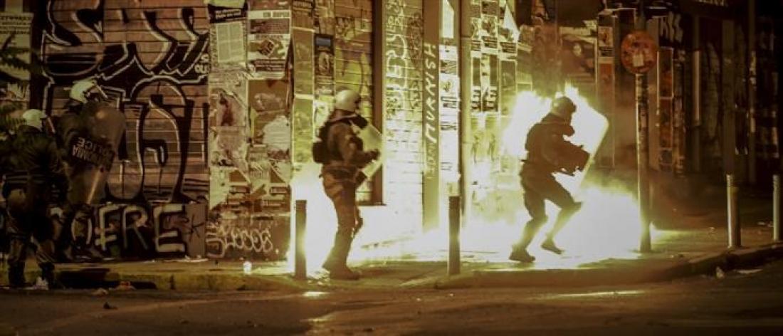 Σε πεδίο μάχης έχουν μετατρέψει κουκουλοφόροι τα Εξάρχεια που πετούν μολότοφ προς τους αστυνομικούς ακόμη και από ταράτσες. Οι φωτιές έχουν σχηματίσει πύρινα οδοφράγματα στη μέση του δρόμου, ενώ μέσα στις φλόγες ρίχνουν εύφλεκτα υλικά για να φουντώσουν τη φωτιά. Η ρίψη μολότοφ συνοδεύεται και με πετροπόλεμο.