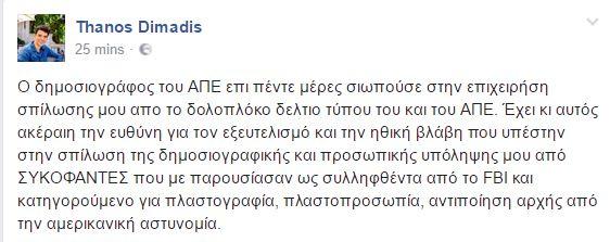 Από την πλευρά του ο Θάνος Δημάδης σχολίασε: «Ο δημοσιογράφος του ΑΠΕ επί πέντε μέρες σιωπούσε στην επιχείρηση σπίλωσης μου από το δολοπλόκο δελτίο Τύπου του και του ΑΠΕ. Έχει κι αυτός ακέραιη την ευθύνη για τον εξευτελισμό και την ηθική βλάβη που υπέστην στην σπίλωση της δημοσιογραφικής και προσωπικής υπόληψης μου από ΣΥΚΟΦΑΝΤΕΣ που με παρουσίασαν ως συλληφθέντα από το FBI και κατηγορούμενο για πλαστογραφία, πλαστοπροσωπία, αντιποίηση αρχής από την αμερικανική αστυνομία»