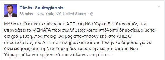 Ο Δημήτρης Σουλτογιάννης έγραψε στην πορσωπική του σελίδα: «Μάλιστα. Ο απεσταλμένος του ΑΠΕ στη Νέα Υόρκη δεν ήταν αυτός που υπογράφει τα ΨΕΜΑΤΑ περί συλλήψεως και το υπόλοιπο δημοσίευμα με τα αισχρά ψεύδη. Άρα ποιος; Θα μας απαντήσουν εκεί στο ΑΠΕ; Ο απεσταλμένος του ΑΠΕ που πληρώνεται από το Ελληνικό δημόσιο για να δίνει ειδήσεις από τη Νέα Υόρκη δεν έδωσε την είδηση από τη Νέα Υόρκη...μάλλον περίμενε κάποιον άλλον να τη δώσει...»