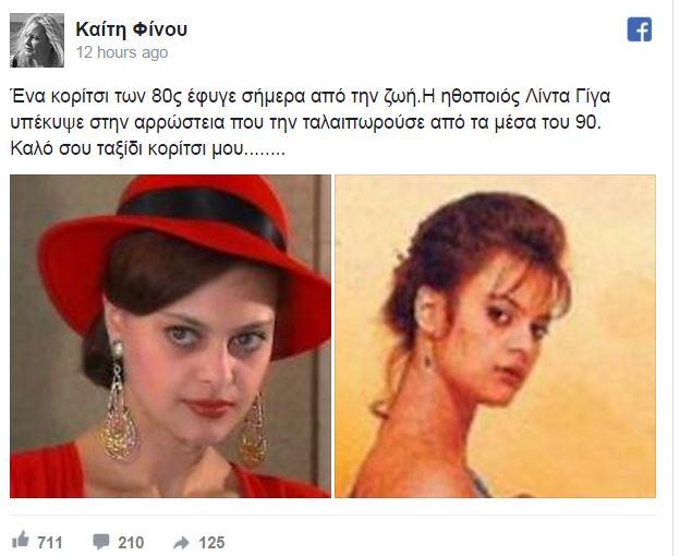 Συγκεκριμένα η Καίτη Φίνου έγραψε: «Ένα κορίτσι των 80s έφυγε σήμερα από την ζωή. Η ηθοποιός Λίντα Γίγα υπέκυψε στην αρρώστια που την ταλαιπωρούσε από τα μέσα του '90. Καλό σου ταξίδι κορίτσι μου».