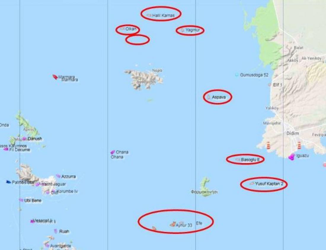 Η εικόνα είναι χθεσινή και δείχνει ότι 10 τουρκικά σκάφη βρίσκονταν γύρω από τα δύο νησιά .