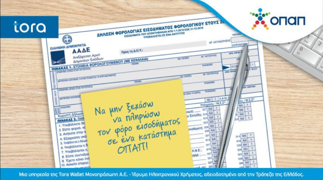 Με άμεση εξυπηρέτηση, χωρίς ουρές και αναμονή, η πληρωμή των δόσεων βεβαιωμένων οφειλών και ρυθμίσεων μπορεί να γίνει σε 3.000 καταστήματα ΟΠΑΠ, σε όλη την Ελλάδα. Η υπηρεσία πληρωμών είναι διαθέσιμη μέσω της tora Wallet, θυγατρικής εταιρείας του ομίλου ΟΠΑΠ, και εξυπηρετεί το κοινό καθημερινά μέχρι αργά το βράδυ, ακόμα και τα Σαββατοκύριακα. Μέσω αυτής πραγματοποιείται μια ευρύτατη γκάμα πληρωμών που καλύπτει συνολικά περισσότερους από 200 λογαριασμούς (Ενέργεια, Ύδρευση, Ασφάλειες, Τηλεπικοινωνίες, καθώς και οφειλές προς το Δημόσιο και τους Δήμους).