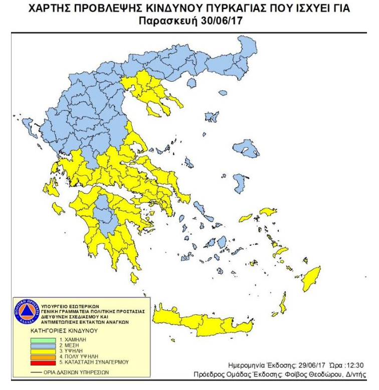 Για τον λόγο αυτό η Γενική Γραμματεία Πολιτικής Προστασίας εξέδωσε αυστηρή προειδοποίηση. Σύμφωνα λοιπόν με τον συγκεκριμένο χάρτη υψηλός είναι ο κίνδυνος πυρκαγιάς στην Πελοπόννησο, την Κρήτη, τα Δωδεκάνησα, τα κεντρικά της Στερεάς Ελλάδας, την Εύβοια, τη Μαγνησία, τα νότια Επτάνησα αλλά και την περιοχή του νομού Θεσσαλονίκης.