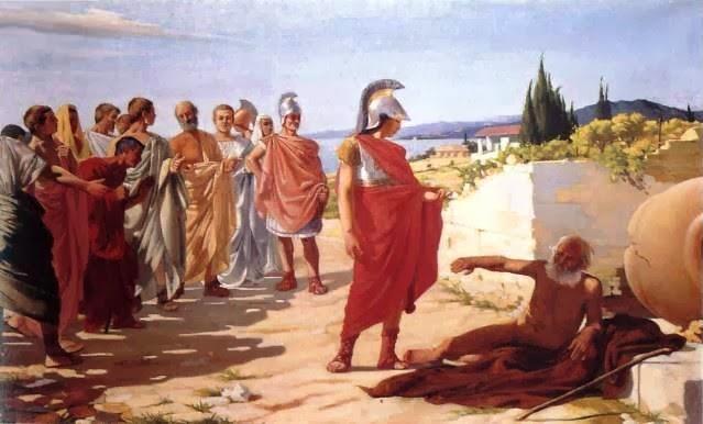 Οταν έφτασε στην Κόρινθο ο Αλέξανδρος πήγε να δει τον Διογένη τον οποίο θαύμαζε. Τον συνάντησε μέσα στο πιθάρι του και τον ρώτησε αν έχει κάποια επιθυμία. Ο Διογένης απάντησε αδιάφορα ότι τον παρακαλεί μόνο να παραμερίσει για να μην του κρύβει τον ίσκιο του. Τότε ο Αλέξανδρος είπε στους δίπλα του: «Αν δεν ήμουν Αλέξανδρος θα ήθελα να ήμουν Διογένης».