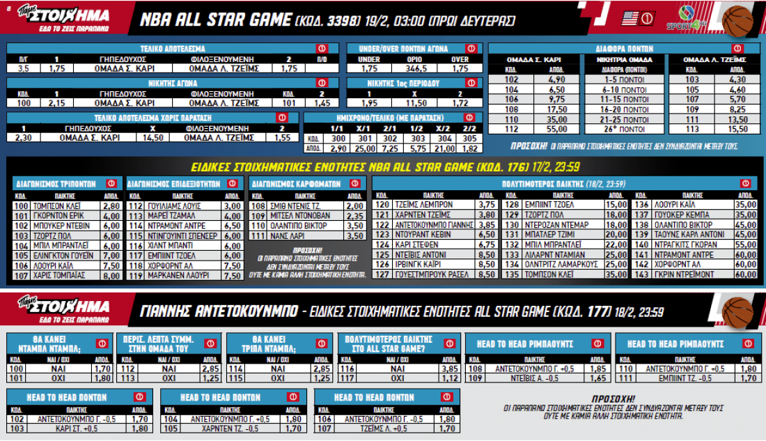 Το του προσφέρει πλήθος ειδικών στοιχημάτων για το NBA All Star Game και τον Γιάννη Αντετοκούνμπο. Στον αγώνα, ανάμεσα στις ομάδες του Στεφ Κάρι και του Λεμπρόν Τζέιμς, οι παίκτες του ΠΑΜΕ ΣΤΟΙΧΗΜΑ μπορούν να ποντάρουν στο τελικό αποτέλεσμα με προβάδισμα 3,5 πόντων για την ομάδα του Κάρι, το τελικό αποτέλεσμα χωρίς παράταση, τον νικητή του αγώνα, τον νικητή της πρώτης περιόδου, το ημίχρονο/τελικό με παράταση, τους under/over 346,5 πόντους και τη διαφορά πόντων.
