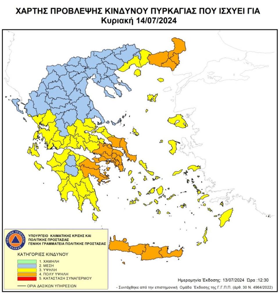 Σύμφωνα με το Χάρτη Πρόβλεψης Κινδύνου Πυρκαγιάς που εκδίδει η Γενική Γραμματεία Πολιτικής Προστασίας του Υπουργείου Κλιματικής Κρίσης & Πολιτικής Προστασίας (civilprotection.gov.gr), για αύριο Κυριακή 14 Ιουλίου 2024, προβλέπεται πολύ υψηλός κίνδυνος πυρκαγιάς (κατηγορία κινδύνου 4) σε πέντε περιφέρειες της χώρας, μεταξύ των οποίων και η Κρήτη.