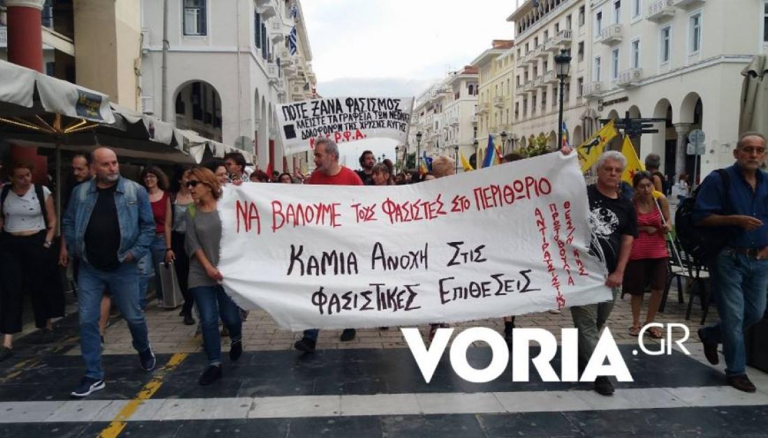 Πορεία στο κέντρο της Θεσσαλονίκης πραγματοποίησαν το μεσημέρι μέλη αντιφασιστικών οργανώσεων, με αφορμή τη συμπλήρωση πέντε χρόνων από τη δολοφονία του Παύλου Φύσσα .