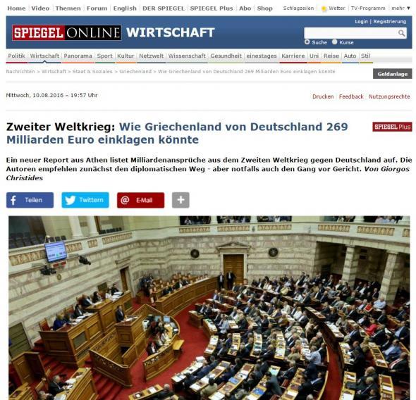 «Πώς η Ελλάδα θα μπορούσε να μηνύσει τη Γερμανία για τα 296 δισεκατομμύρια ευρώ που της χρωστάει», είναι ο τίτλος δημοσιεύματος του γερμανικού περιοδικού Spiegel, το οποίο αναφέρεται στις γερμανικές αποζημιώσεις του Β 'Παγκοσμίου Πόλεμου που οφείλει η Γερμανία στην Ελλάδα.