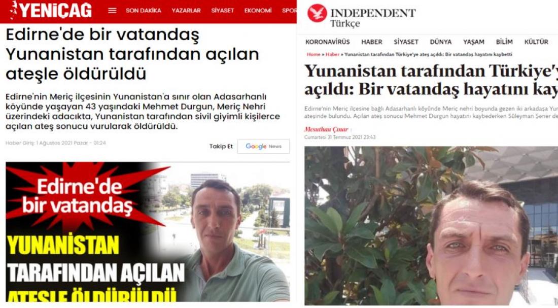 “Σύμφωνα με το DHA, ένας πολίτης σκοτώθηκε από ελληνικά πυρά στην Αδριανούπολη. Το περιστατικό συνέβη περίπου στις 19.00 στο χωριό Adasarhanlı, στα ελληνικά σύνορα της περιοχής του Έβρου. Ο Μεχμέτ Ντουργκούν και ο φίλος του Σ.Σ. πήγαν στη νησίδα στον ποταμό Έβρο για να πάρουν τα σκάφη που χρησιμοποιούσαν παράνομα μετανάστες για να διασχίσουν τον ποταμό μαζί του.
