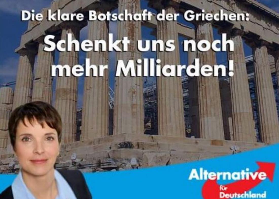 Στη διαφήμιση, που έχει φόντο τον Παρθενώνα, αναγράφεται με μεγάλα γράμματα: "Το ξεκάθαρο μήνυμα των Ελλήνων! Χαρίστε μας κι άλλα δισεκατομμύρια!". Σε tweet της, η επικεφαλής του κόμματος, Φράουκε Πέτρι, παραθέτει τη διαφήμιση, σχολιάζοντας: "Κι άλλοι φορολογικοί λογαριασμοί (Γερμανών) θάβονται στην άμμο: Στο σούπερ εκλογικό έτος, τα παλιά κόμματα το αποσιωπούν"... Σημειώνεται ότι στην Γερμανία το συγκεκριμένο κόμμα που γνωρίζει μεγάλη άνοδο, έχει δεχτεί επικρίσεις από πολλούς πολιτικούς της χώρας και ΜΜΕ ως κόμμα με όμοια ατζέντα με αυτή των Ναζί...