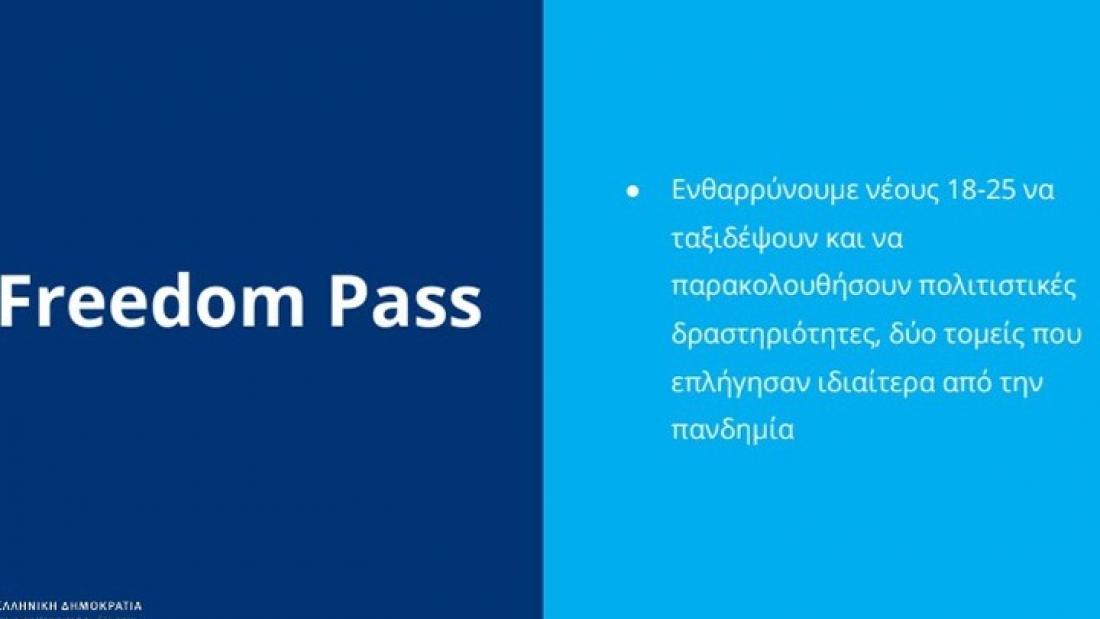«Ύστερα από 16 μήνες αναμέτρησης με τον κορονοϊό η χώρα δείχνει να κερδίζει τη μάχη μένοντας πάντα σε επιφυλακή» είπε ο πρωθυπουργός ξεκινώντας την παρουσίαση. «Όλο αυτό το διάστημα η κυβέρνηση στήριξε το ΕΣΥ, τους εργαζομένους και τις επιχειρήσεις, ένα πολύπλευρο πρόγραμμα ύψους 40 δισ. ευρώ. Έχει έλθει η ώρα η πολιτεία να επιβραβεύσει μία ηλικιακή ομάδα που επλήγη από τον κορονοϊό. Αναφέρομαι στους νέους 18 - 25 ετών, που είναι 940.000» τόνισε ο Κυριάκος Μητσοτάκης και συμπλήρωσε: «Από σήμερα ανοίγεται ένα παράθυρο ελευθερίας για τον ελεύθερο χρόνο τους. Με την πρώτη δόση εμβολιασμού θα αποκτούν μία προπληρωμένη κάρτα ύψους 150 ευρώ για ταξίδια και για πολιτιστικά δρώμενα».
