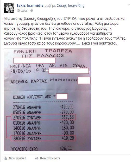 Ενδεικτκή είναι η απόδειξη από την κίνηση λογαριασμού συνταξιούχου με ημερομηνία 28/06/16 και ώρα 19.08 από την οποία προκύπτουν τα εξής: