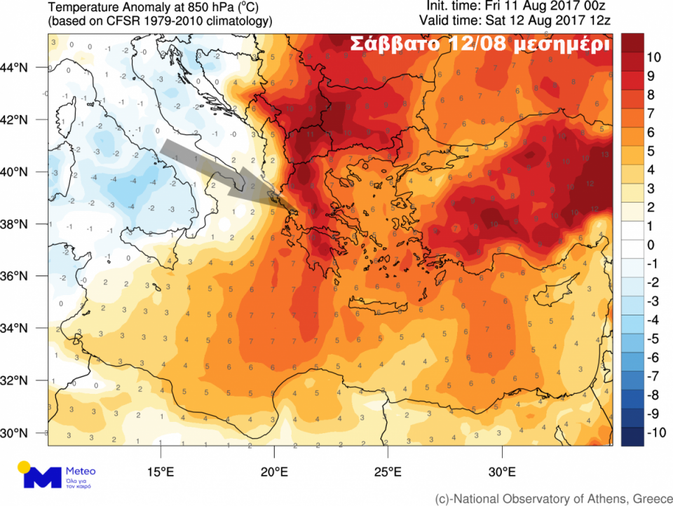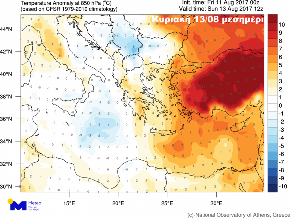 Χάρτες απόκλισης της θερμοκρασίας σε ύψος περίπου 1.500μ από τη μέση τιμή της περιόδου 1979-2010 το μεσημέρι του Σαββάτου (Χάρτης 2 αριστερά) και το μεσημέρι της Κυριακής 13/08 (Χάρτης 3 δεξιά).