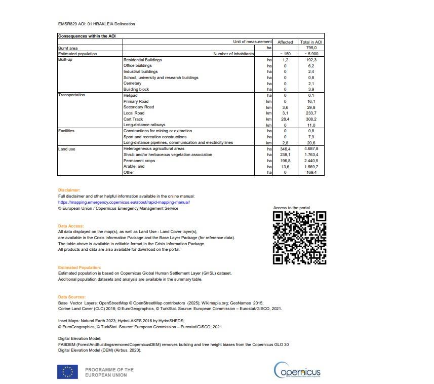Αναλυτικά, οι εκτάσεις που κάηκαν σύμφωνα, με την υπηρεσία Copernicus, είναι 3.610 στρέμματα αγροτικές/ χορτολιβαδικές, 1.960 στρέμματα καλλιέργειες και 2.380 δασικές εκτάσεις.