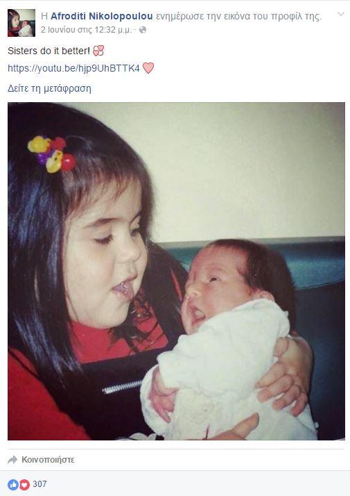 Με μια συγκινητική φωτογραφία η αδερφή της Νίκης Νικολοπούλου, Αφροδίτη, τιμά στο Facebook τη μνήμη της αδερφής της.